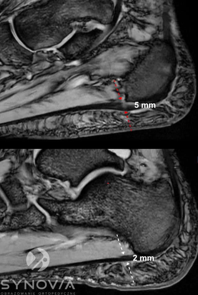 Co widać: Szczegółowa ocena powięzi, obrzęk szpiku kostnego w kości piętowej, przydatne w różnicowaniu przyczyn.