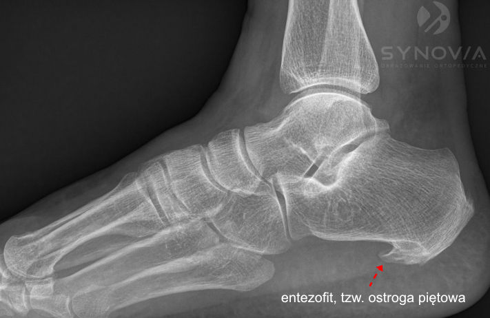 Co widać: Ostroga piętowa – kostny wyrostek w miejscu przyczepu powięzi. Obecna również u wielu bezobjawowych osób.