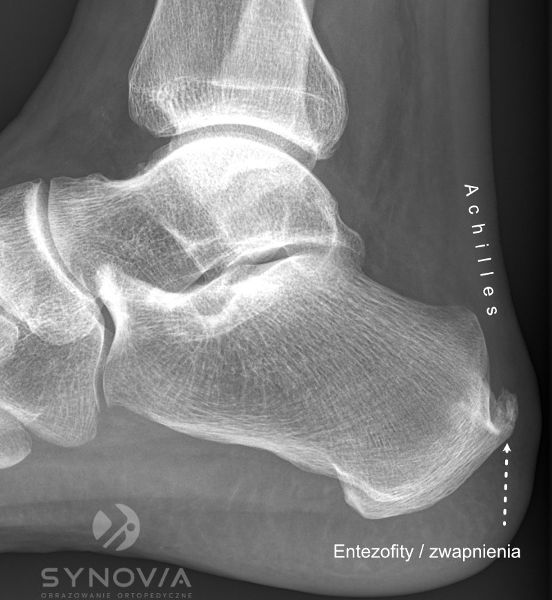 Co widać: Entezofity – kostne wyrostki w miejscu przyczepu, ewentualnie nadżerki kości (w chorobach reumatycznych).