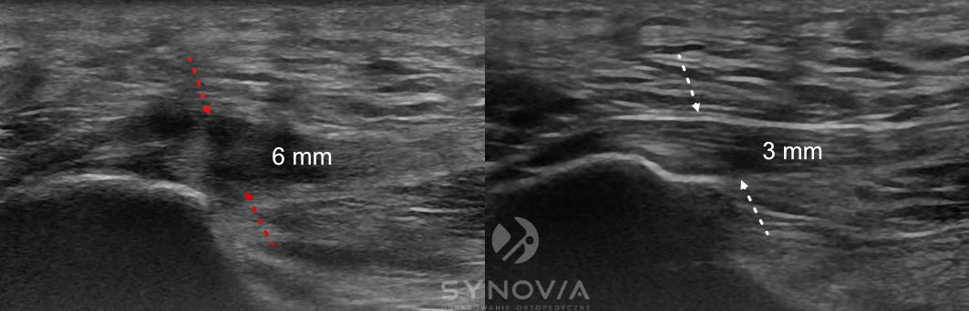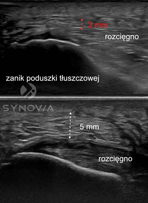 Co widać: Pogrubienie ścięgna, zaburzenie struktury włókienkowej, hipoechogeniczne obszary naderwań, wzmożone unaczynienie, płyn w kaletkach.